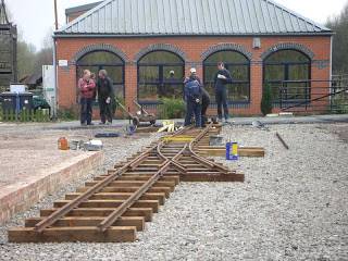 On Saturday 17 March 2007, the development of the Moseley Railway Trust’s new site at Apedale, Staffordshire, passed a major milestone with the laying of the first track. Recent weeks have seen significant progress with groundworks to provide a trackbed, and work has now commenced on installing 2’0″ gauge trackwork. The first set of points to be installed will ultimately form one end of the station run-round loop.