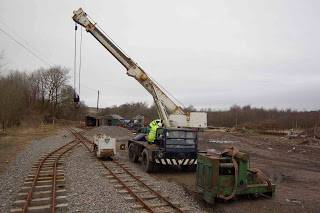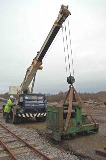 As the Moseley Railway Trust edges towards opening a passenger railway, an area receiving increasing attention is that of training. We obviously need to ensure that we have people with the appropriate knowledge and skills (or “competencies” as they’re known in the trade) to carry out the multiplicity of jobs on the railway. And it’s not only the railway. The MRT has a number of items of heavy plant, which are invaluable to the railway building effort, but could cause serious harm in the hands of an ill-trained operator. And so a batch of four intrepid members spent last Saturday being trained to drive and control the Trust’s crane. The unwilling participant in all of this was loco No.34 – Ruston 164350. Delivered in May1933, this Ruston is one of the oldest in existence, and is one of the rare “front tank” types – which use a mass of water for cooling rather than the more conventional water/air heat exchanger. Why did it have the starring role – well it happened to weigh just the right amount to allow testing of the crane overload system – a procedure which had the MRT’s safety officer going for a nice cup of tea and sit down afterwards. Nonetheless, a vital test and perfectly safe when administered by competent people. Before you all ask, yes, all four members passed the course. The crane, by the way, is a Coles Speedcrane. We can only assume that the name was invented before the advent of the Trades Description Act and after a long liquid lunch.