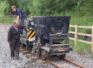 If there is one lesson which I for one have learnt from building the Apedale Valley Light Railway, it is to not under-estimate that amount of ballast which needs to be deployed. We have recently completed a rather elegant series of sweeping curves, and it was apparent that we needed to ballast this as soon as possible such that the railway will hold its form. We have been employing the centre-discharge ballast wagon loaned to the Moseley Railway Trust by the Golden Valley Light Railway, and this does a fine job at dropping stone between the running rails. However, forming the shoulders on each side of the rails is equally, if not more, important. Until recently, this has been a slightly fraught process using two small side-tipping skip wagons. However, we now have another ballast wagon on load – this time a specialist side discharge wagon. This one has been loaned to the Trust by Graham Lee and his team at the Statfold Barn Railway – a big public thank you to Graham. The ballast trains have been shuttling back and forth along the railway, dropping tons of stone. It’s beginning to look like a mighty fine railway – all that remains now is to tamp it all into place. So, if you fancy a bit of a tamp, get in touch here. And don’t forget, you will get a chance to come along to the Open Days in 2009 and see all we have done.