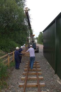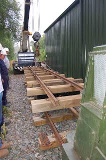 …where no Ruston has been before. These are the voyages of the starship “Vanguard”. Actually rather a second rate starship; Captain Kirk’s Enterprise was powered by Dilithium Crystals and had two warp nacelles, whereas Vanguard has a 20hp two-cylinder diesel engine. Nonetheless, Vanguard has indeed boldly gone where no Ruston has been before. For various reasons, the railway on the Moseley Railway Trust’s site at Apedale has been in two disconnected sections. The push is now on to join these two sections, and this has entailed the rather delicate task of of track laying in the limited space between the new footpath fence and the Aurora North storage shed. The pre-assembled track panels were brought to site on a flat wagon using Vanguard. The Trust’s crane, having been very careful threaded into place, was then used to lift the panels into place. What could be easier? And so the main line of the Apedale Valley Light Railway grew substantially today, and at the end of the day’s work, Vanguard was able to set a new record for the furthest North travelled by an MRT loco at Apedale. The gap to link the two railways is now about 40′, so two sections of track will now be built in-situ to close this. This will then finally allow rail access to the roadside tramway section, which we are hoping will be a prominent part of the September 12 & 13 Open Days at Apedale. If you fancy coming along and helping with this type of thing, come along or contact us here. The ability to confidently split infinitives is a definite benefit.