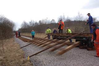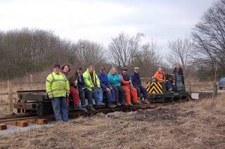 Both regular readers will recall where we left it last week; a small gap in the Apedale Valley Light Railway was all that remained to allow our hero (the Ruston “Vanguard”) to reach Apedale Road, terminus of Phase One of the Moseley Railway Trust’s passenger railway. I’m sure you will be relieved to hear that the gap, 4880mm to be precise, is now no more. A train has now been seen at the buffer stops at Apedale Road. This allowed us to get wagons loaded with track panels for the platform loop into place, and the panels were then carefully, and gracefully, slid into place with the assistance of gravity. There was just time for a quick team photo. Meanwhile, did you see Apedale on the telly? Our colleagues at the Heritage Centre provided their mine for the BBC’s Survivors series, which was broadcast on Tuesday. The blog from 8 August last year shows the programme being filmed. As ever, get in touch here.